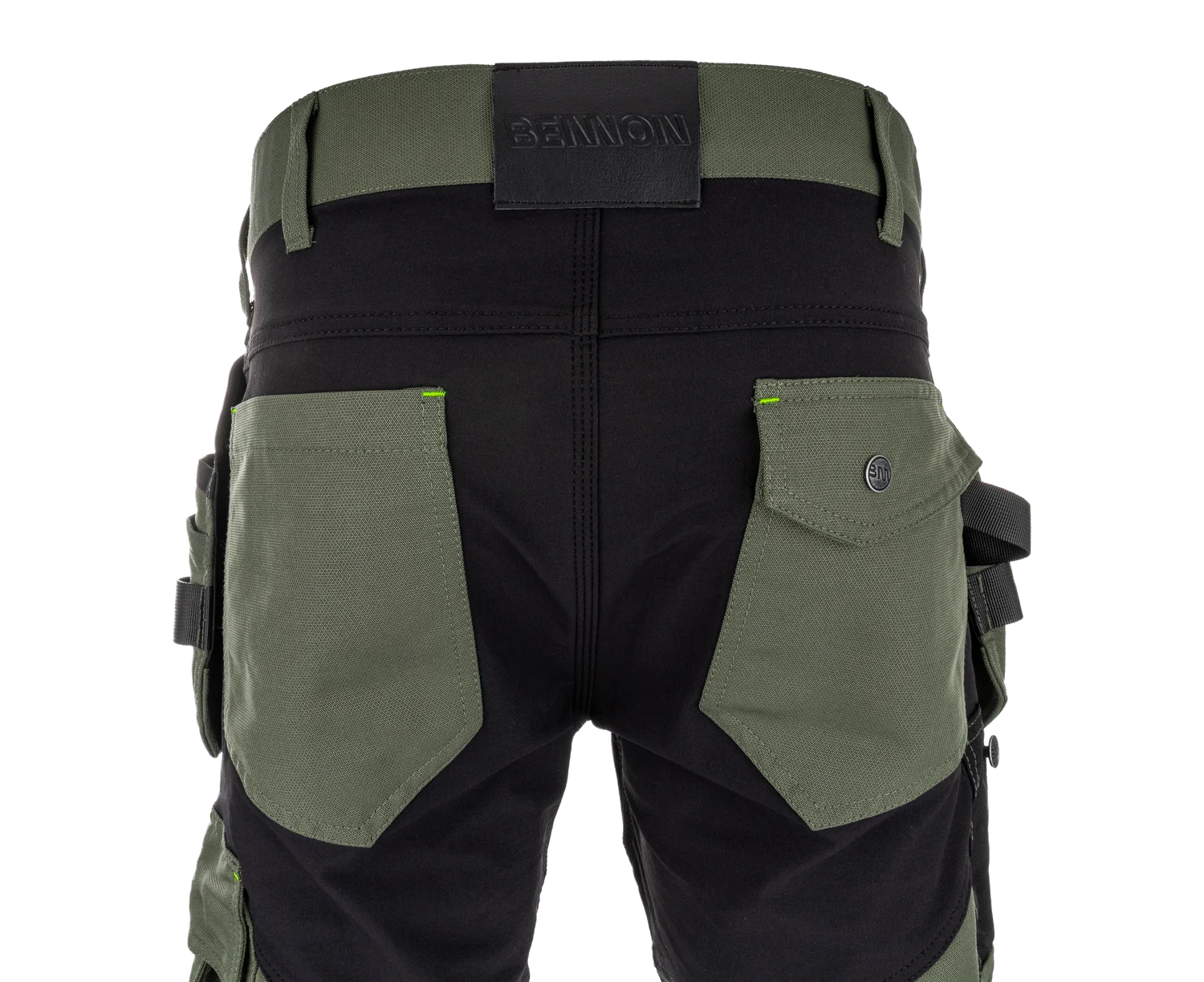Profesionálne pánske pracovné kraťasy sú navrhnuté pre maximálnu odolnosť a funkčnosť v náročných podmienkach. Kombinácia pevného materiálu s pružnými zónami v oblasti sedu a rozkroku zabezpečuje pohodlie aj pri dynamickej práci.