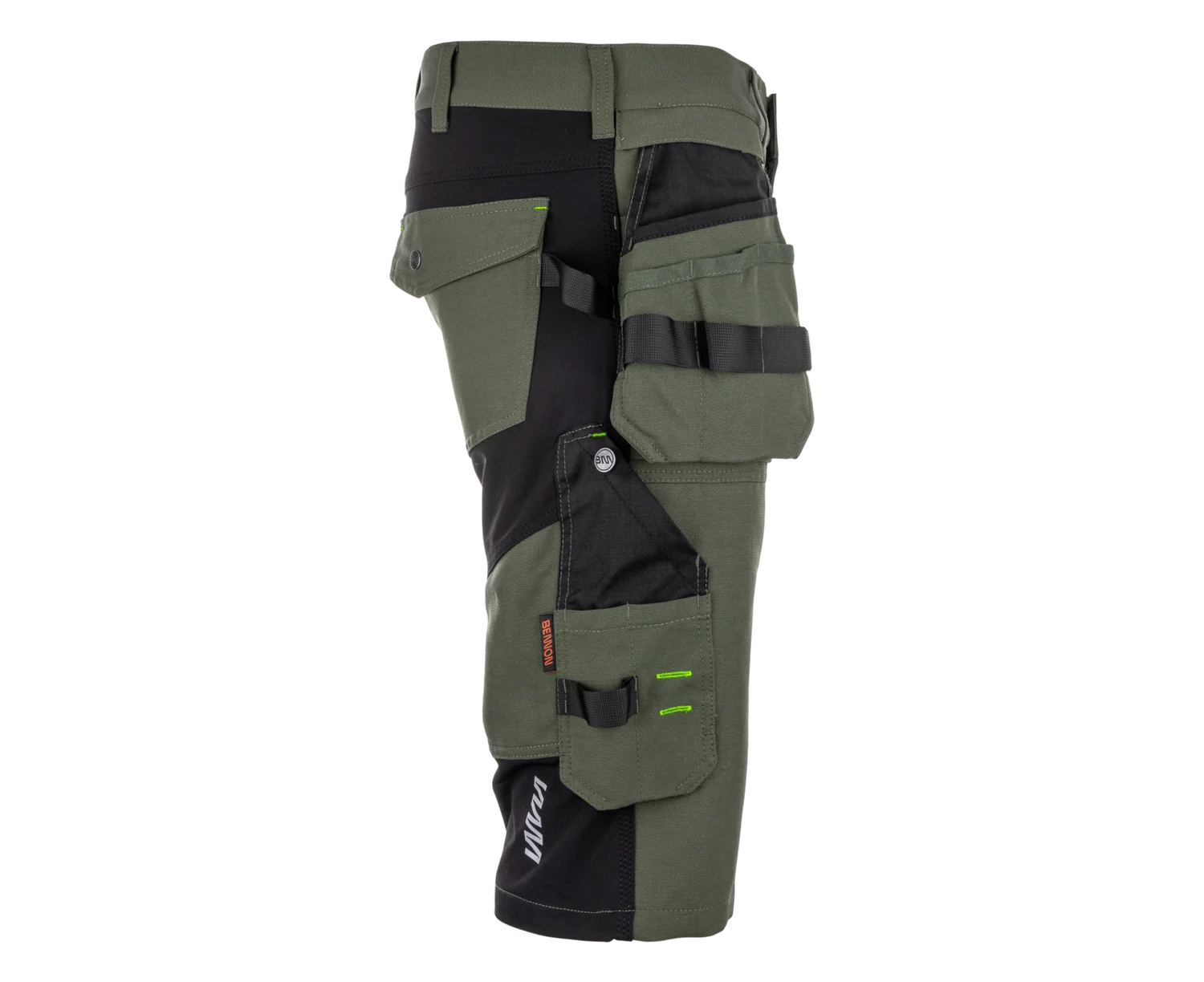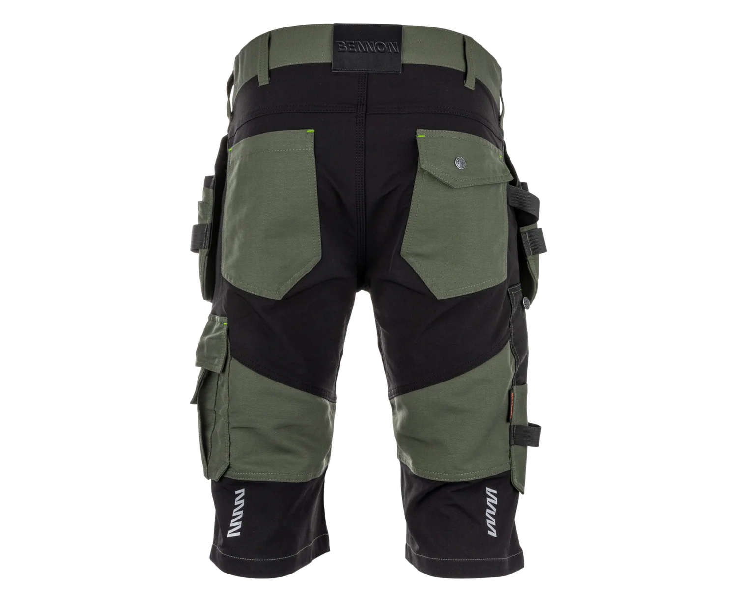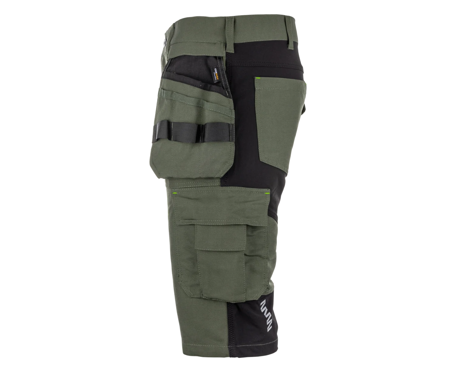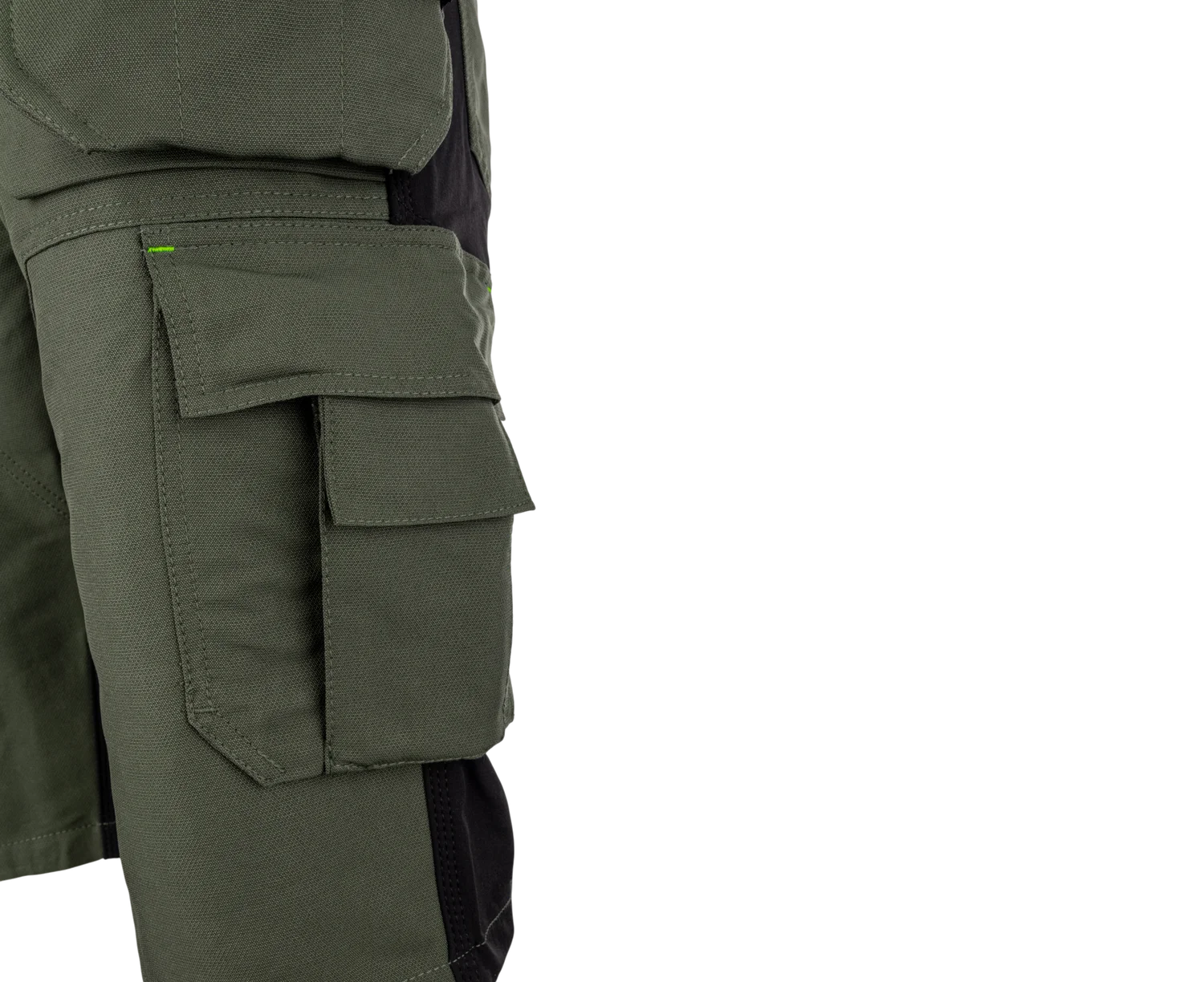 Strečové pracovné kraťasy s výstuhami Cordura 500D ponúkajú vysokú odolnosť a pohodlie pri práci. Odopínateľné kapsy na náradie, vodoodpudivá úprava a množstvo praktických vreciek zvyšujú funkčnosť. Reflexné prvky zlepšujú viditeľnosť za šera aj v noci.