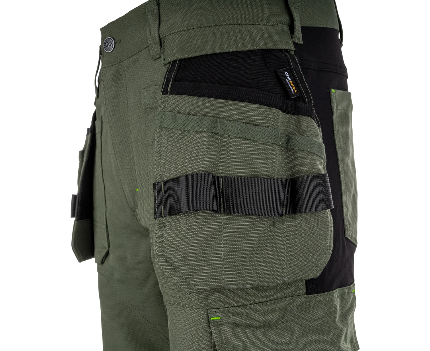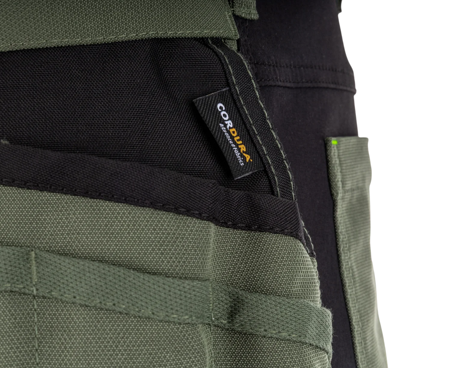 Zosilnenie Cordura 500D v namáhaných miestach výrazne zvyšuje životnosť kraťasov. Odopínateľné kapsy na náradie, vrecká na skrutkovače, kladivo, meter či mobil ponúkajú praktické riešenie pre každého remeselníka. Vodoodpudivá úprava chráni pred vlhkosťou a reflexné prvky zvyšujú bezpečnosť pri práci.