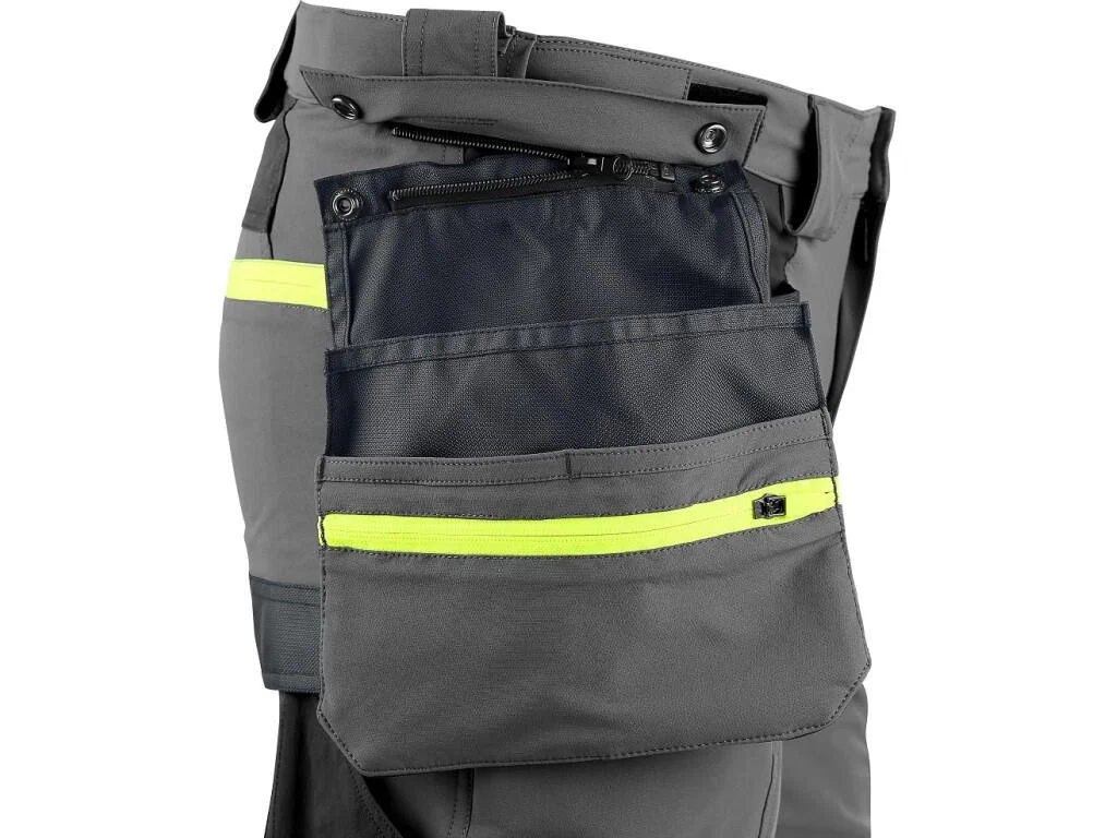 Namáhané časti sú zosilnené materiálom CORDURA® – kolená, spodok nohavíc aj vrecká. Odnímateľné kapsy na náradie, stehenné vrecko s puzdrom na ID kartu a ventilácia na stehnách zvyšujú funkčnosť aj komfort pri práci.
