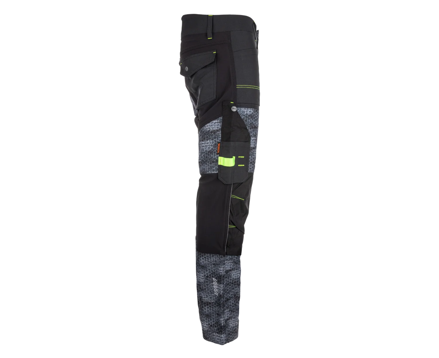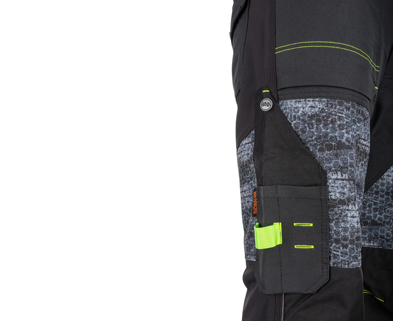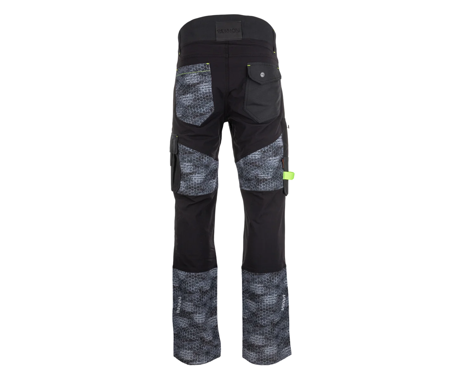 Pohodlné pánské strečové pracovní kalhoty s jemným maskáčovým vzorem • pevný odolný materiál, v oblasti sedu a rozkroku však velmi pružný zajišťující volnost při pohybových aktivitách • zvýšený pas zamezující odhalení bederní části při předklonu – omezení prochladnutí • namáhané části kolen a kapes jsou zpevněny materiálem Cordura 500D, což znamená, že se vyznačují vysokou pevností a odolností vůči oděru a jiným mechanickým poškozením • kapsy na šroubováky, hřebíky a kladivo, kapsa na skládací metr • kapsa na kolenní vycpávky zpříjemňující práci vkleče • poutka na zavěšení nářadí • vodoodpudivý zátěr • reflexní prvky na nohavicích pro vaši bezpečnost za tmy a šera • textilní štítek na jmenovku • nastavitelná délka nohavic (z vnitřní strany kalhot lze jednoduše odpárat prodlužující záhyb) • tento výrobek splňuje normu: EN ISO 13688:2013/A1:2021 Doporučené použití: práce ve vnitřních i venkovních prostorech