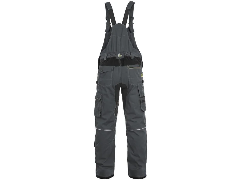 Zosilnené kolená a spodné lemy z odolného 600D polyesteru chránia najviac namáhané miesta. Praktické multifunkčné vrecká, elastické traky a reflexné prvky robia z týchto montérok spoľahlivý pracovný odev do náročného prostredia.